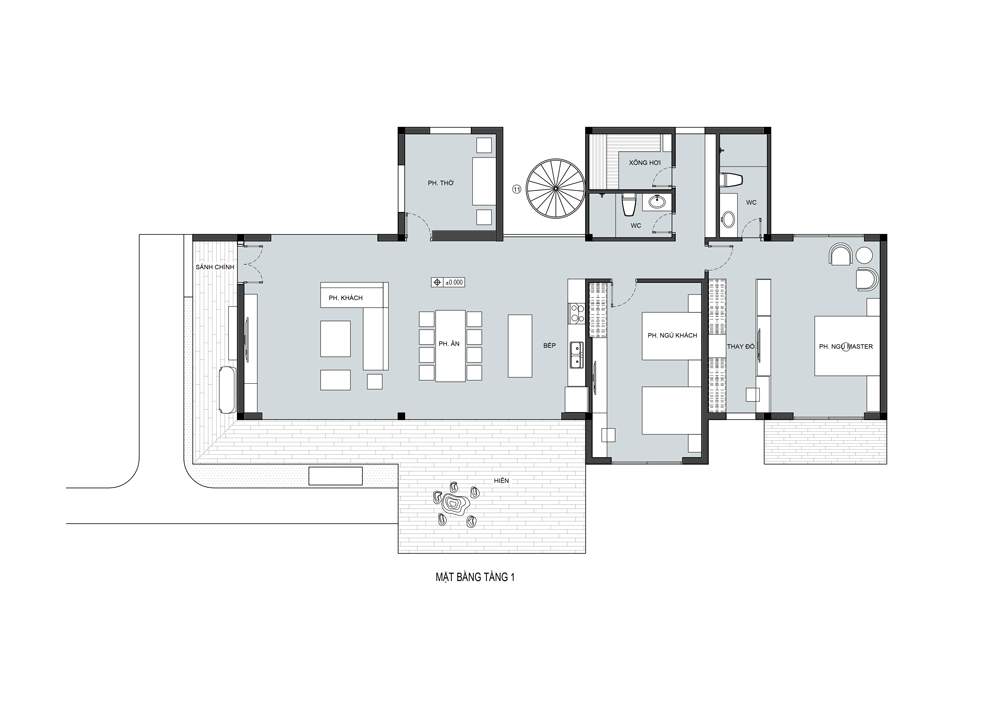 Kiến trúc sư đã đẩy toàn bộ công trình phụ, ít sử dụng sang hướng tây như vệ sinh và phòng thờ, để che nắng cho phòng ngủ chính. Mục đích công trình xếp hình khối so le, cao thấp, có khaonrg hở và đặc biệt là bức tường cao vừa tạo điểm nhấn cho công trình vừa có tác dụng che nắng cho công trình, bóng đổ của khối này che cho khối kia giảm được lượng nhiệt đáng kể cho không gian sử dụng bên trong.