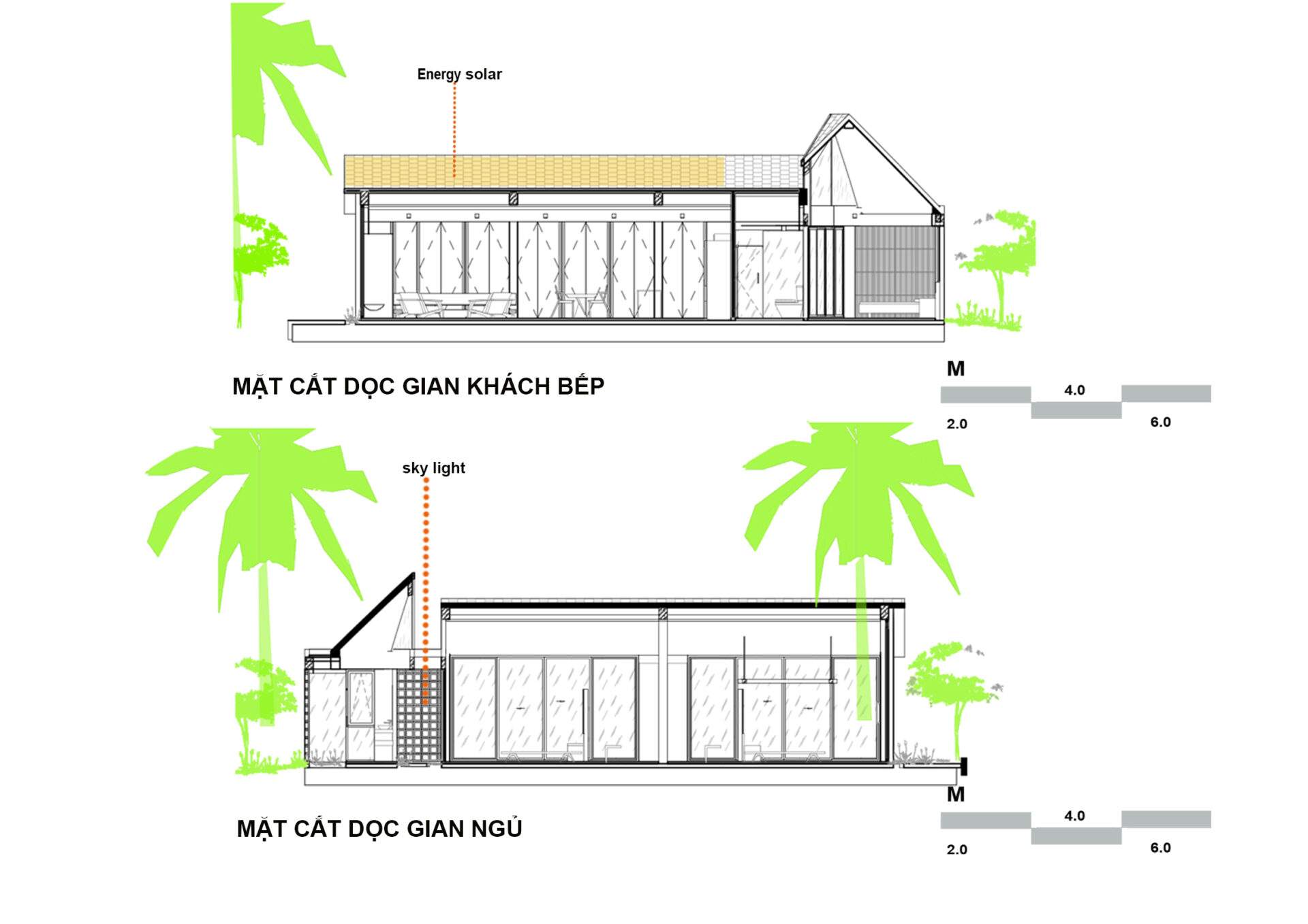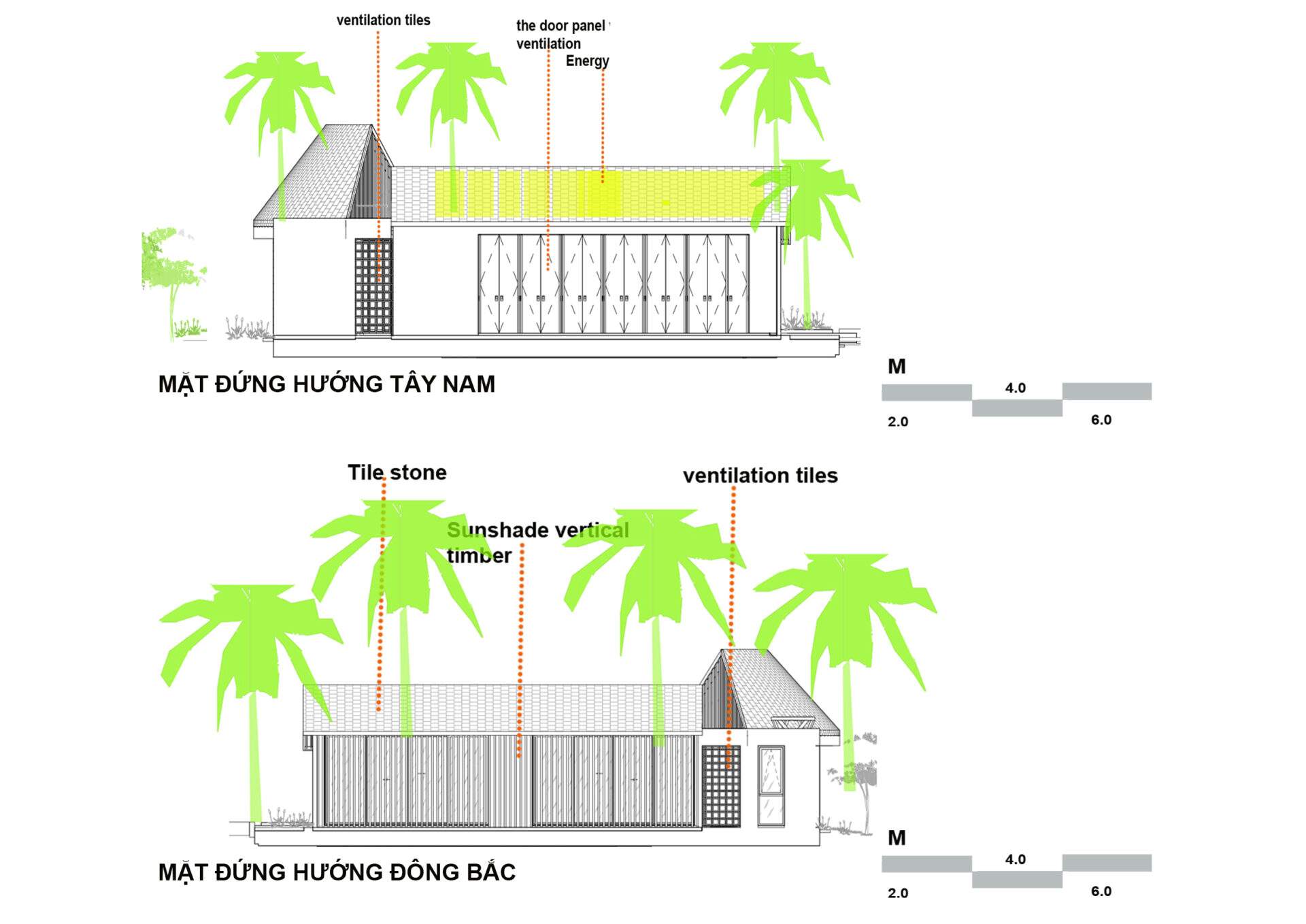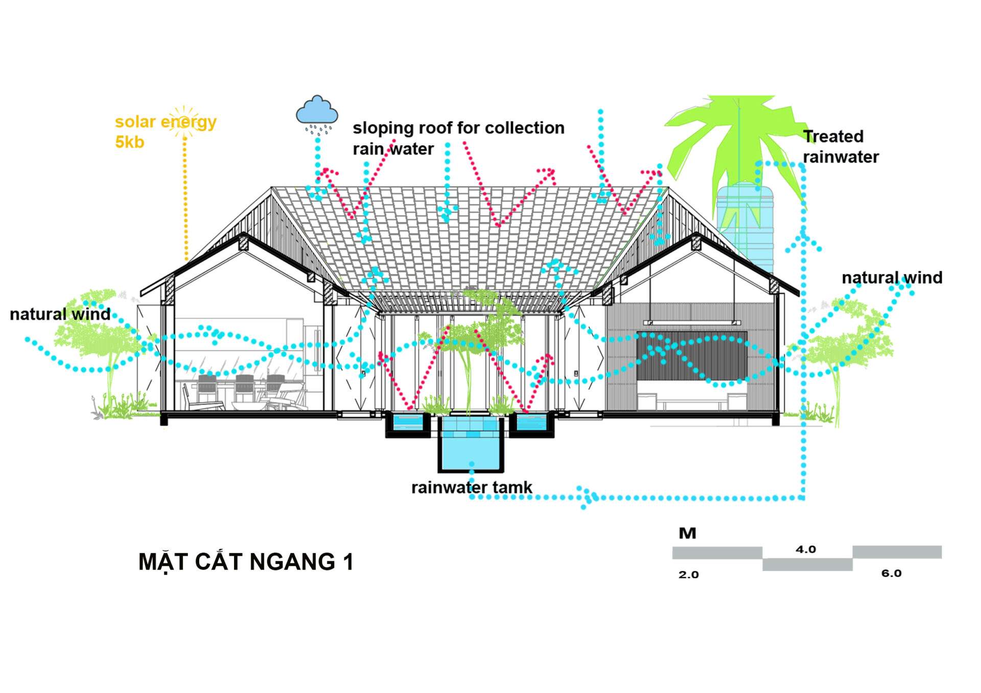 Nhóm KTS đã đưa ra đề xuất thiết kế là đảm bảo tất cả không gian sử dụng không sử dụng điện chiếu sáng ban ngày, hoàn toàn không sử dụng quạt, điều hòa, sử dụng điện năng lượng mặt trời, thu nước mưa tái sử dụng cho việc tưới tiêu sân vườn.