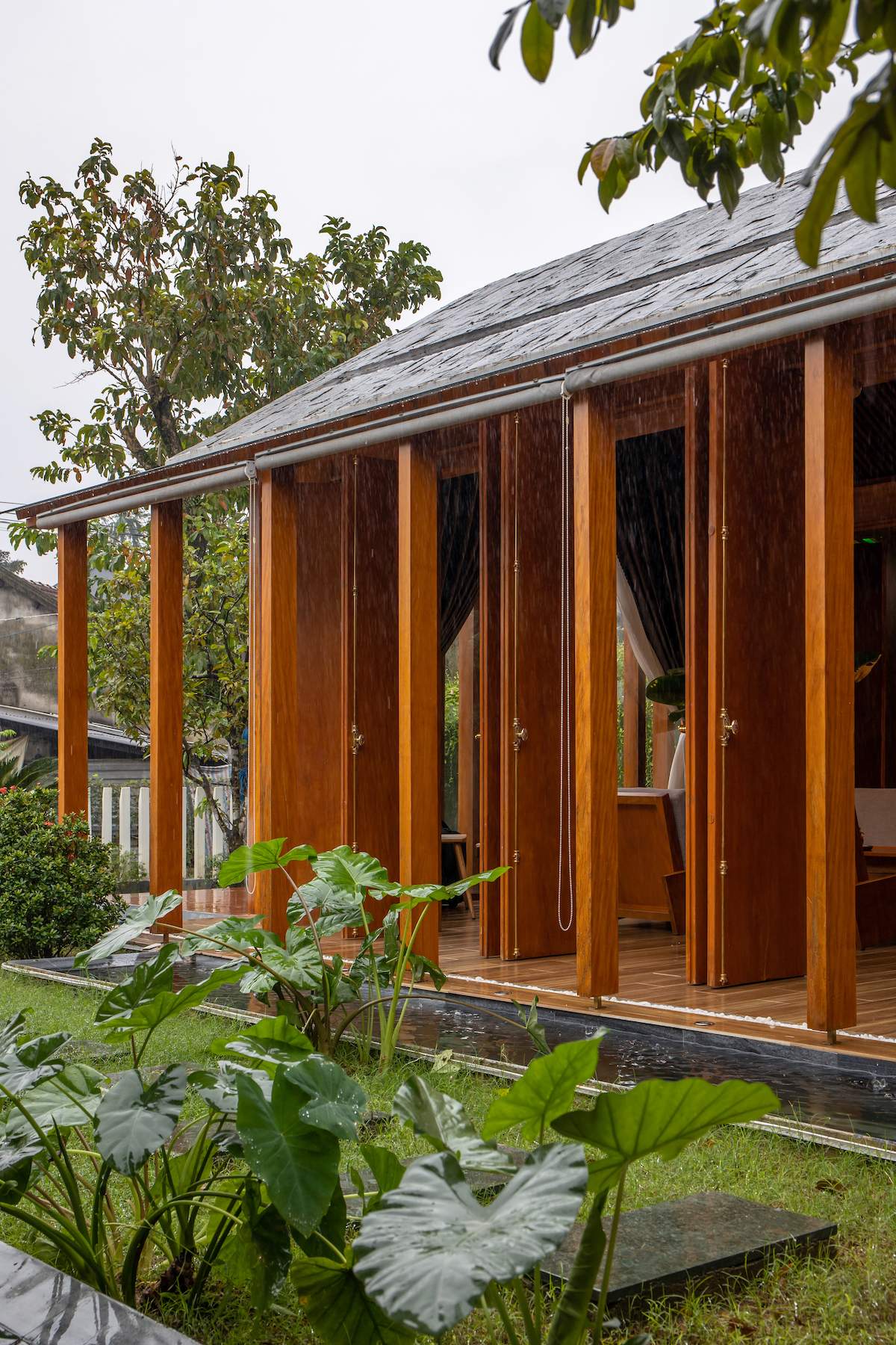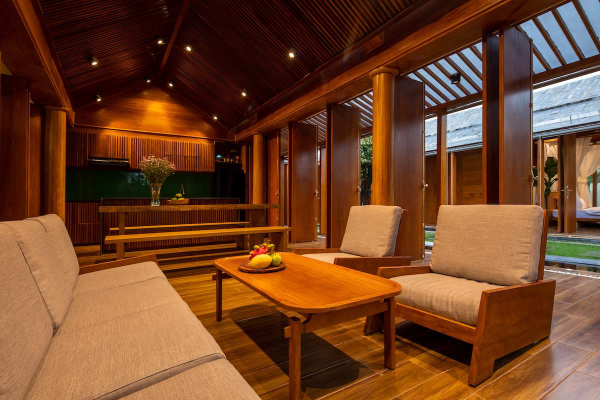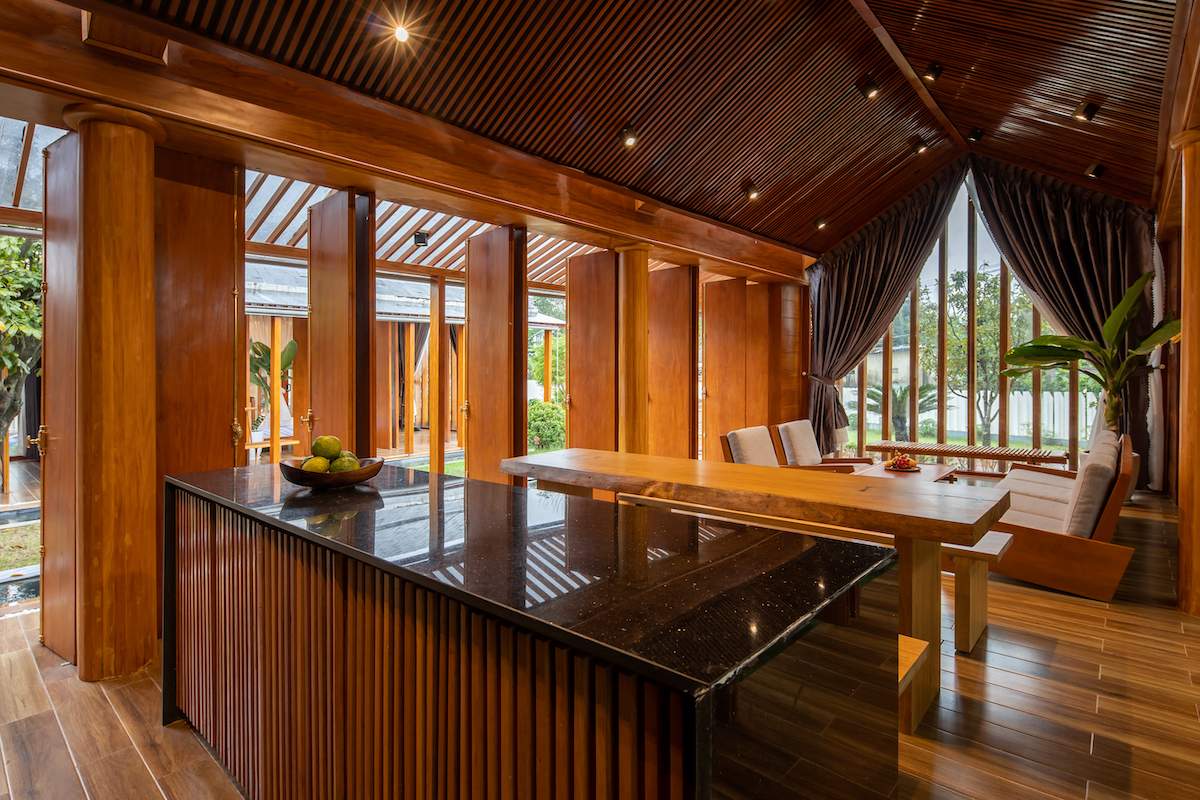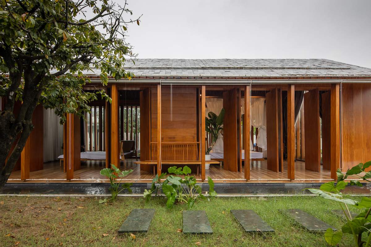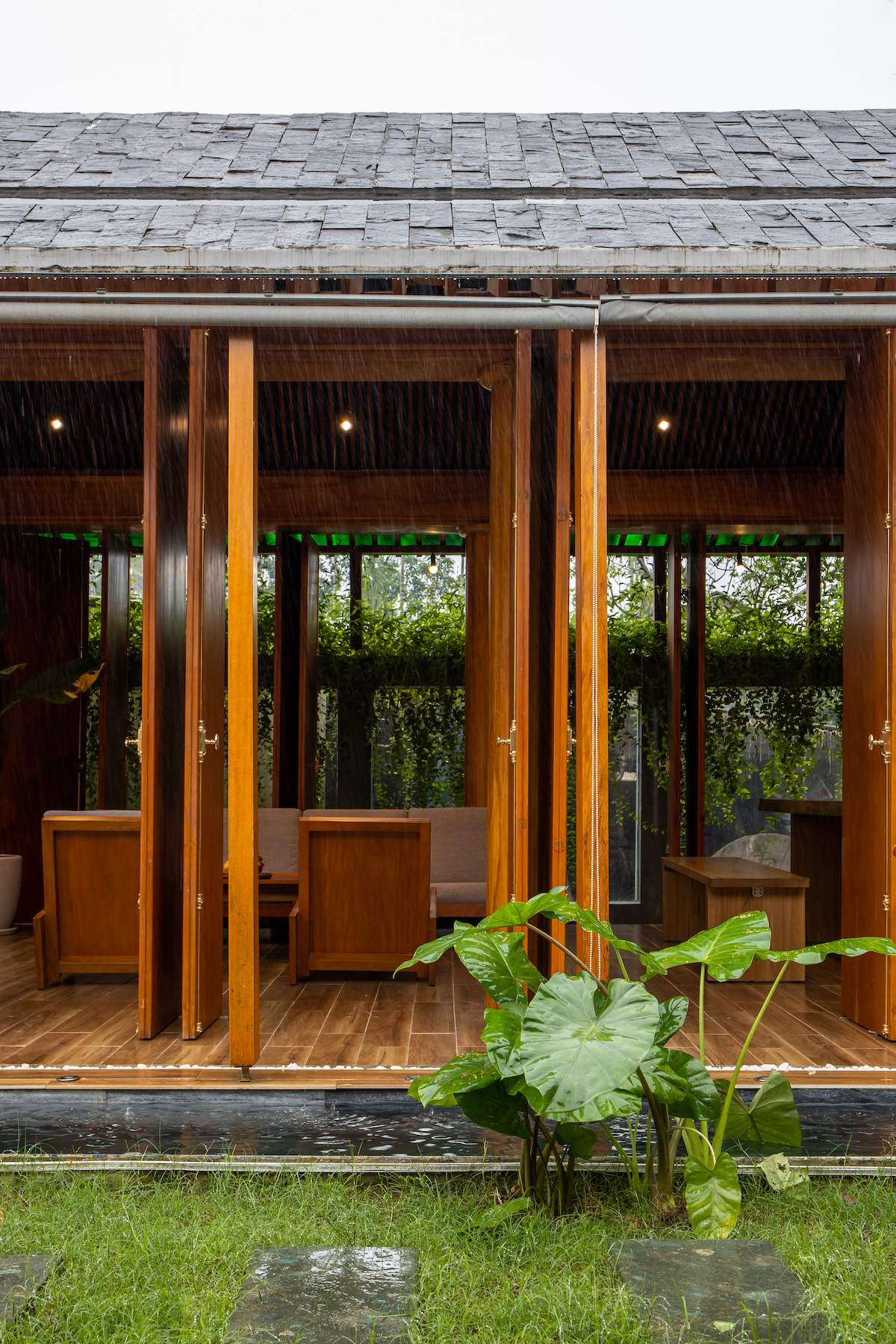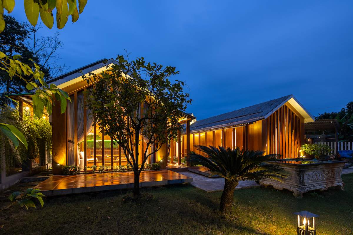 Mẫu thiết kế biệt thự nhà vườn - Công trình sử dụng gỗ mít ta để làm tường bao che, vách lam che nắng, vách gỗ, trần đóng gỗ keo vàng