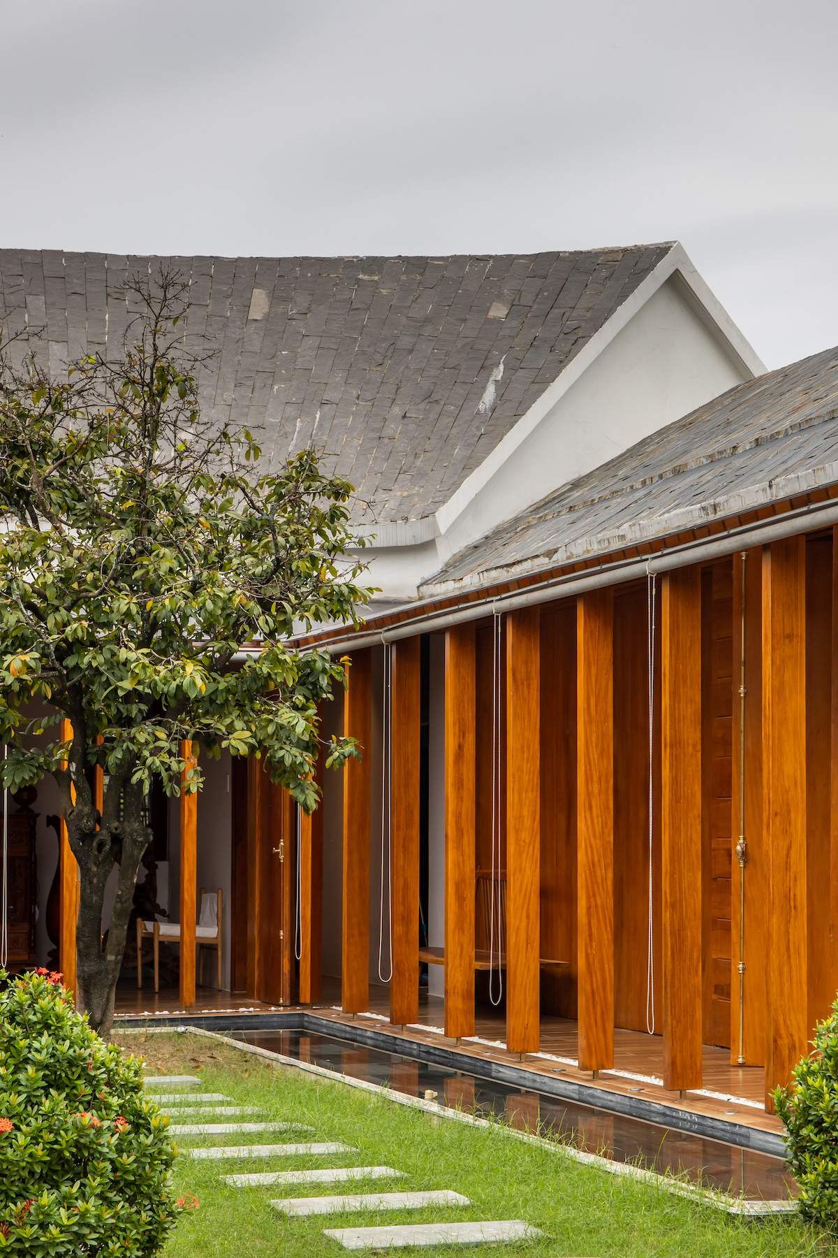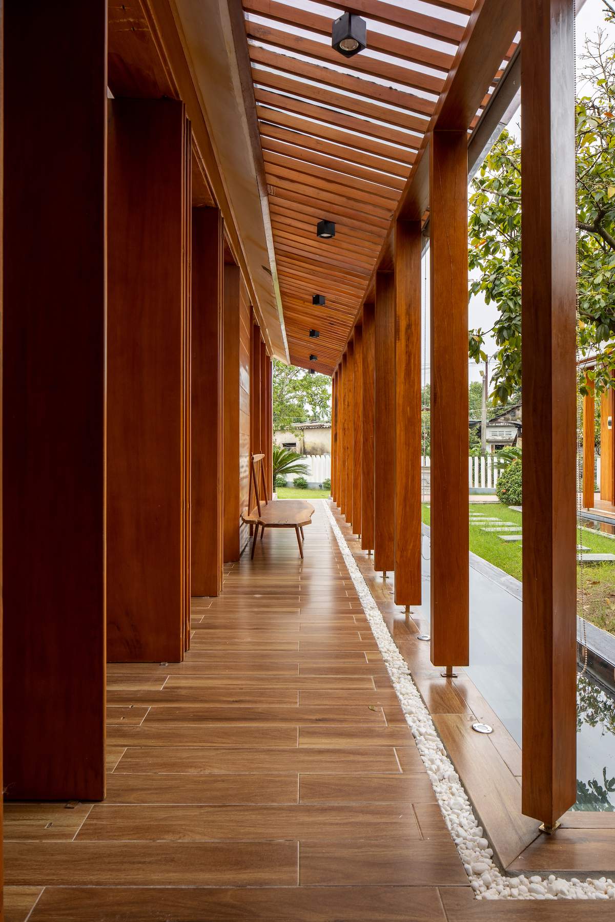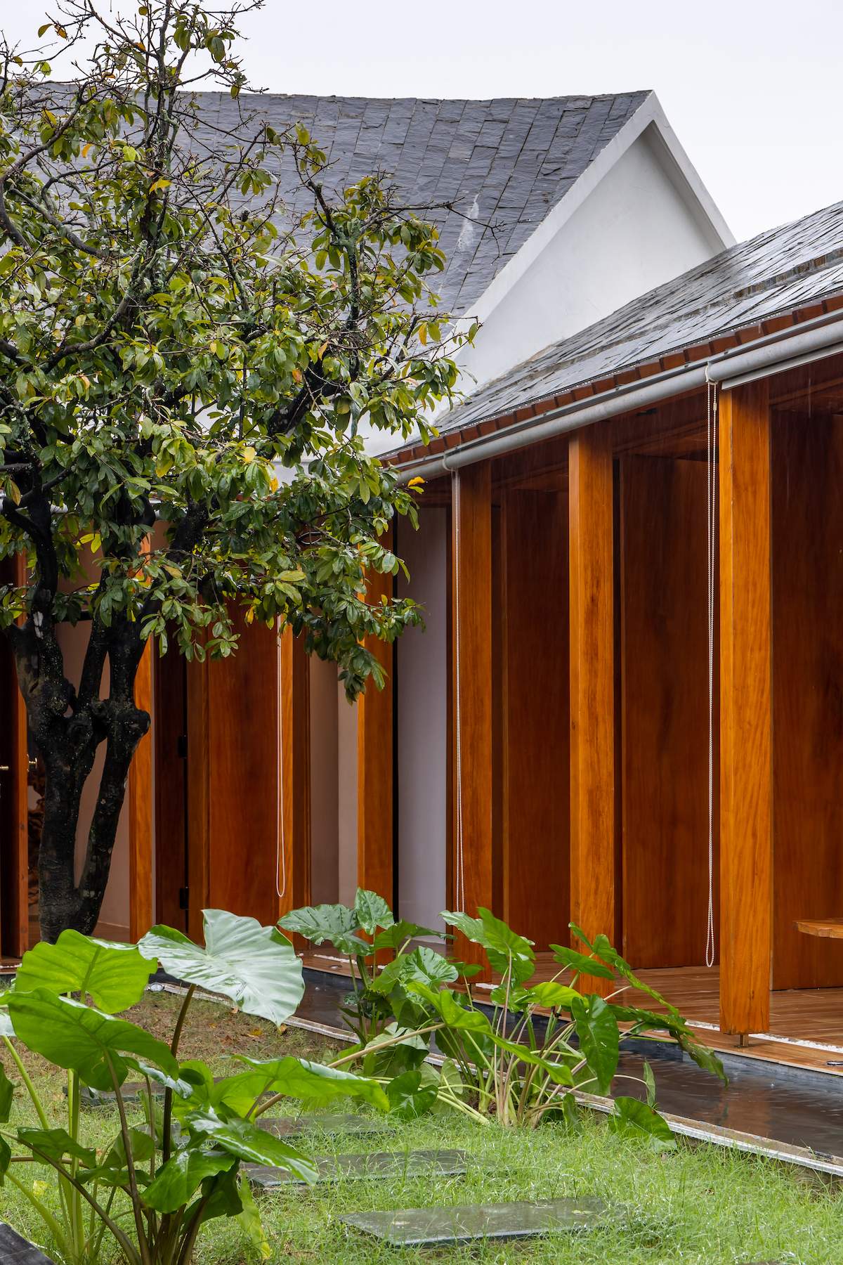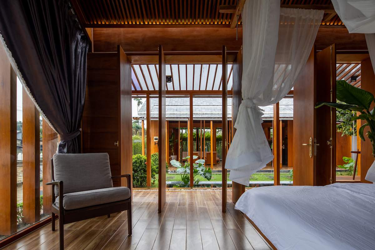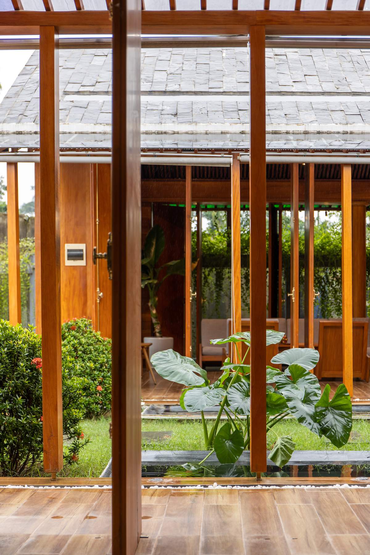 Mẫu thiết kế biệt thự nhà vườn - Công trình sử dụng gỗ mít ta để làm tường bao che, vách lam che nắng, vách gỗ, trần đóng gỗ keo vàng