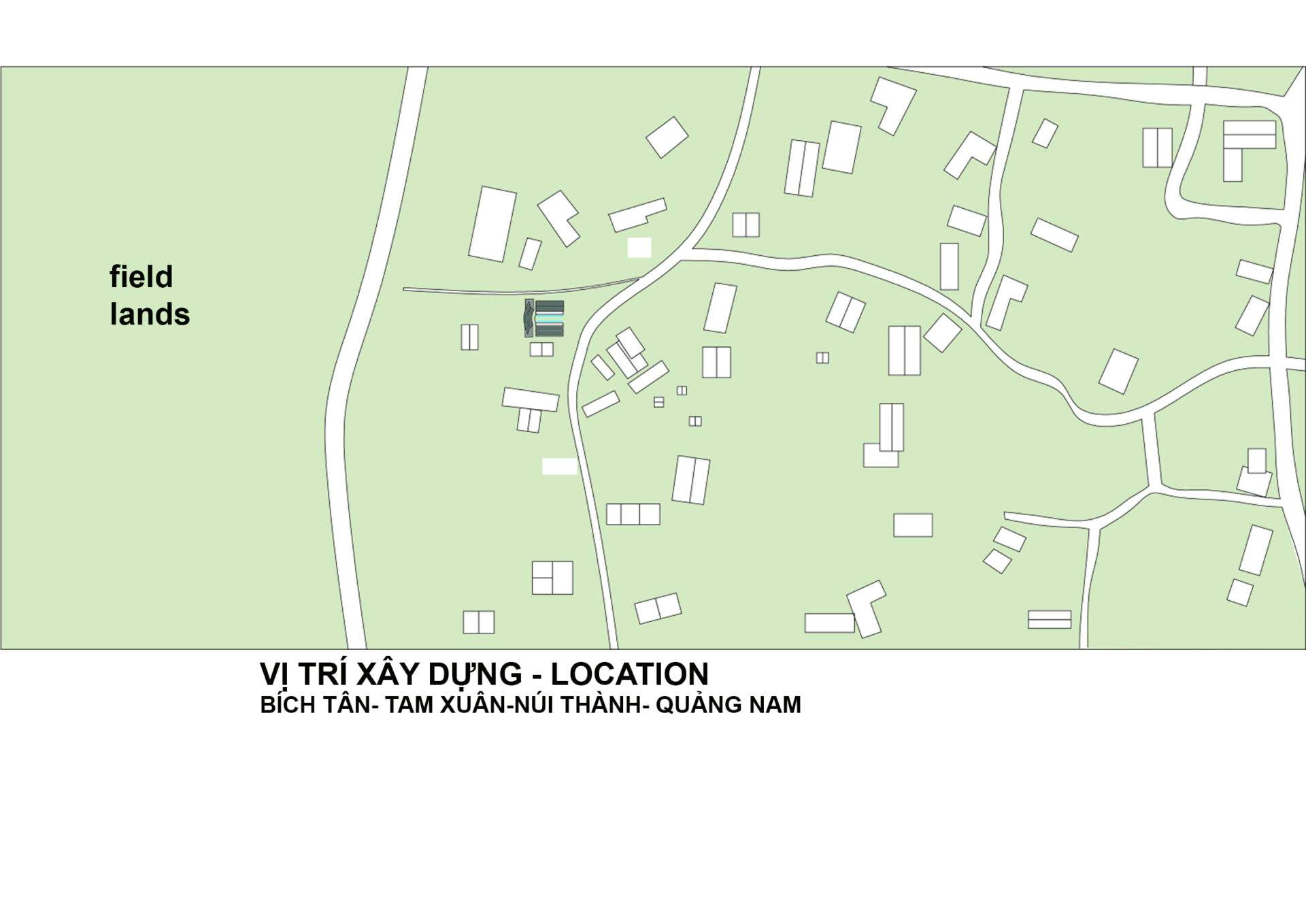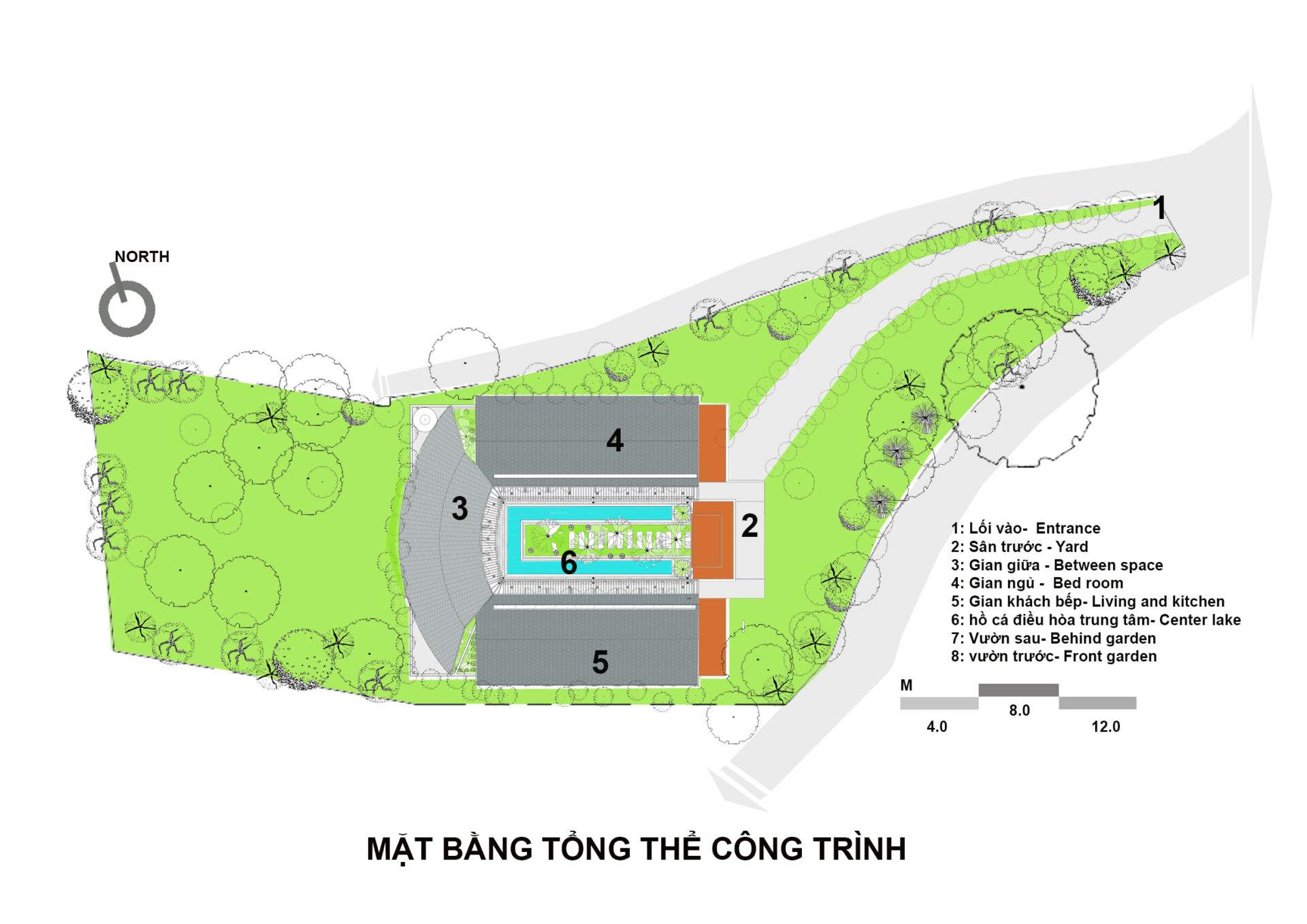 Công trình có khoảng lùi 12m so với đường bê tông chính liên xã, tạo một khoảng sân vườn lớn phía trước nhằm giảm thiểu tác động khói bụi, tiếng ồn, từ xe cộ, có không gian xanh và di dời cổng nhà cũ sang góc bên phải tạo chiều sâu không gian và có khoảng đệm cho công trình.