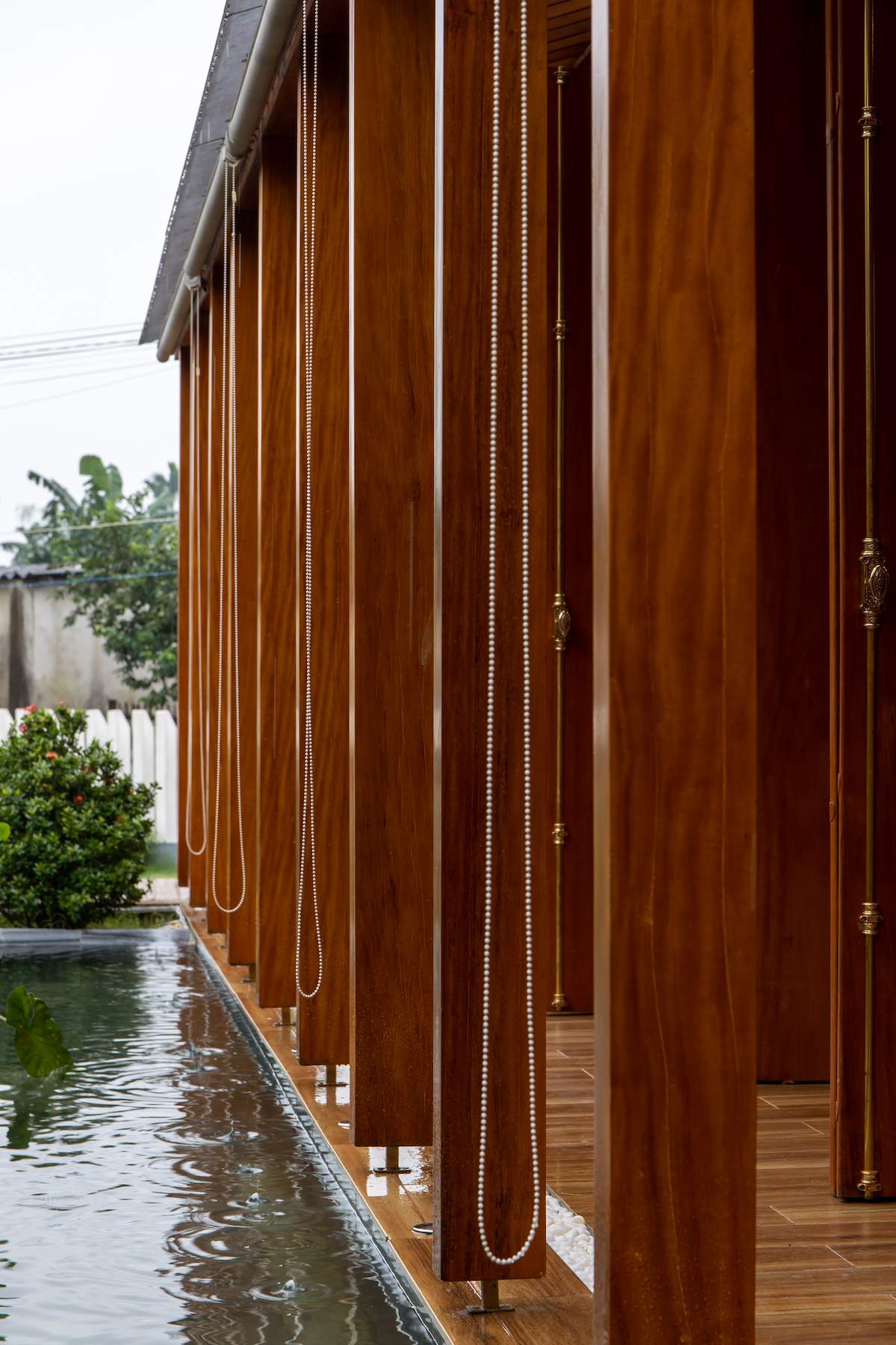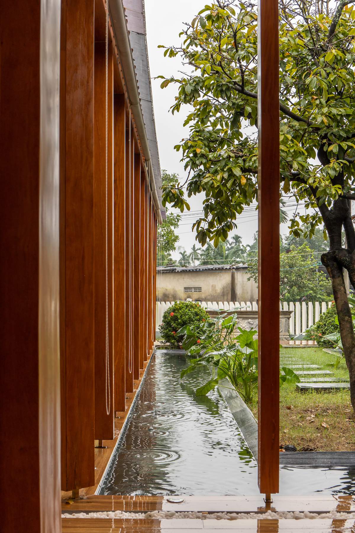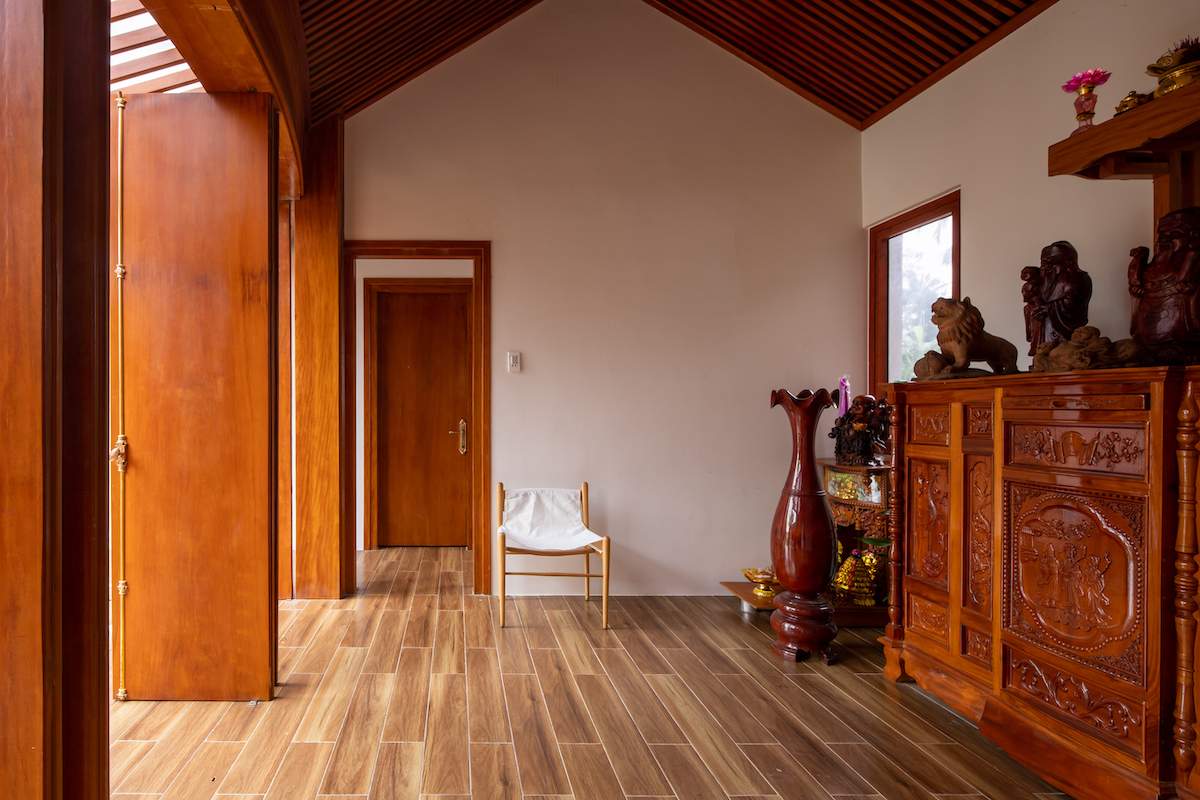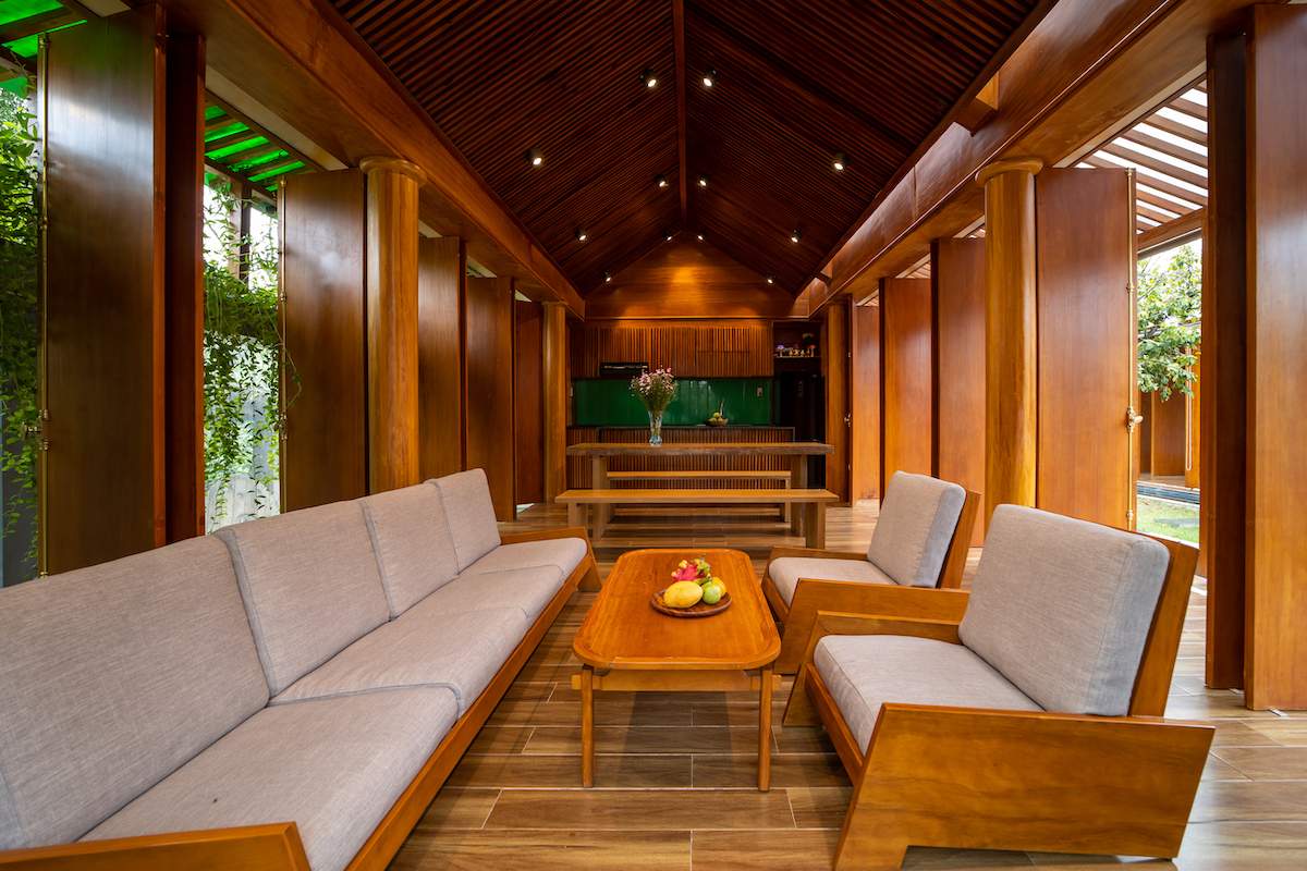 Đồng thời, ngôi nhà sử dụng tối đa các điều kiện tự nhiên sẵn có như gỗ mít, gỗ keo tràm, đá xanh,… nhằm giảm thiểu tối đa nguồn năng lượng điện, nước. Công trình cũng được xoay về hướng Nam, tổ chức cây xanh, mặt nước giữa công trình nhằm đón gió,đối lưu không khí và hạn chế bức xạ nhiệt vào mùa hè.