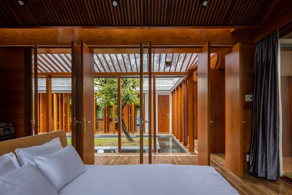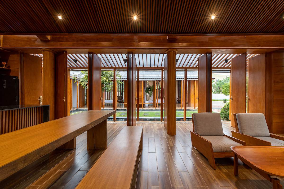 Không gian bên trong được chia làm 3 gian bao gồm khách và bếp, 3 phòng ngủ, một phòng thờ và 2 phòng vệ sinh. Lấy hồ nước và sân trong làm trung tâm kết nối các không gian lại với nhau bởi một hành lang được xem như là hiên nhà truyền thống, vừa làm khoảng đệm cho các không gian sử dụng, vừa che mưa, che nắng, và hỗ trợ tối đa sự tương tác giữa thiên nhiên với con người, giữa con người với con người. Từ đó tạo sự kết nối tối đa ánh sáng, gió tự nhiên, con người cảm nhận được hơi thở của thiên nhiên tốt hơn. Mọi không gian bên trong công trình đều sử dụng ánh sáng tự nhiên và lấy gió mát từ con sông Tam Kì phía sau thổi vào bởi hệ cửa lùa hướng Đông Bắc. Việc tận dụng lợi thế tối đa các mặt thoáng tiếp xúc tự nhiên nhằm sử dụng khí trời, gió tươi, sử dụng hệ lam đứng và tường dây leo đã cải thiện được bức xạ nhiều trực tiếp từ mặt trời hướng tây.