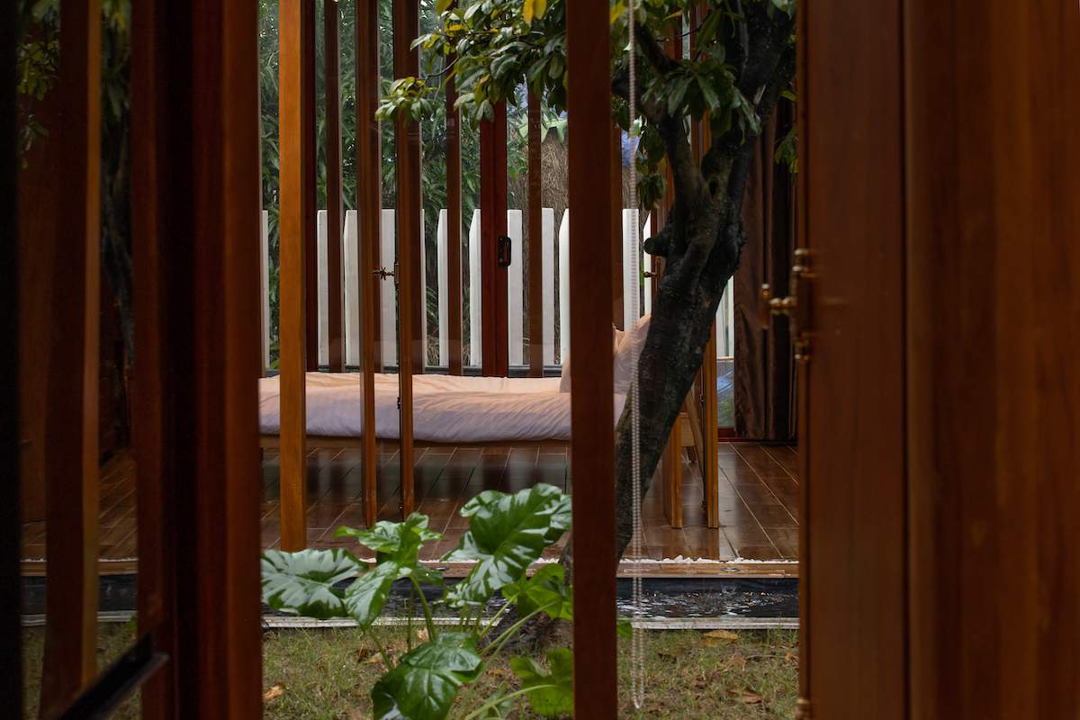 Kết hợp những vật liệu bền vững như bê tông cốt thép chịu lực, lợp mái đá tự nhiên, sử dụng gỗ mít ta để làm tường bao che, vách lam che nắng, vách gỗ, trần đóng gỗ keo vàng. Đặc biệt nhóm KTS hạn chế xây tường và sử dụng 50 bộ cửa bức bàn, hàng hiên bọc quanh hồ nước trung tâm giúp kết nối các không gian chặt chẽ.
